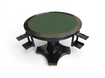 Original runder Spieltisch, gefertigt um das Jahr 1910. Vier aufklappbare Ablagemöglichkeiten für Spielsteine. Tischplatte mit grünem Filz.