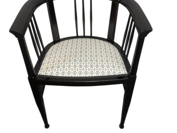 Beschreibung: Armlehnstuhl im Jugendstil-Design, gefertigt aus Buchenholz. Schwarz gebeizt und mit einem hochwertigen Stoff mit Jugendstil-Dekor bezogen. Es sind acht Stück des Modells vorhanden.