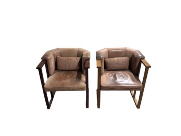 Armlehnstühle im Jugendstil-Design, gefertigt um 1980. Design angelehnt an Josef Hoffmann. Eichenholzkonstruktion mit Lederpolsterung. Zustand vor des Restaurierung – Farbton und Bezug nach Wunsch. Es sind zwei Stück des Modells vorhanden. Der Preis bezieht sich auf das restaurierte Stück.