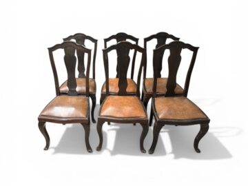 Diese Original Sessel wurden um das Jahr 1910 gefertigt. Die Sitzfläche und die Rückenlehne wurden mit braunem Leder bezogen und mit Messingnägeln beschlagen. Die Stühle überzeugen durch ihr elegantes und hochwertiges Erscheinungsbild und die originalen Messingschuhe an den Sesselbeinen. Ein Neubezug mit Stoff oder Leder ist nach Wunsch gerne möglich. Insgesamt sind sechs Stück des Modells vorhanden.