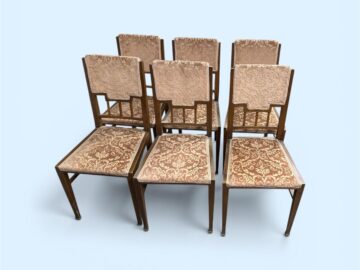 Dieser Original Stuhl wurde um das Jahr 1910 gefertigt. Er überzeugt durch sein elegantes Design und die schönen Einlegearbeiten auf der Rückenlehne. Auf Wunsch ist es möglich den Stuhl neu mit Stoff oder Leder zu beziehen. Insgesamt sind sechs Stück des Modells vorhanden.