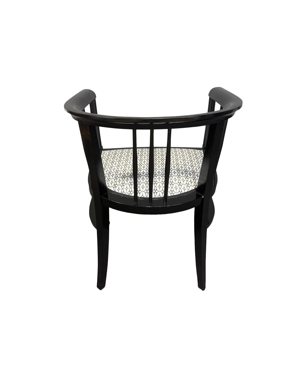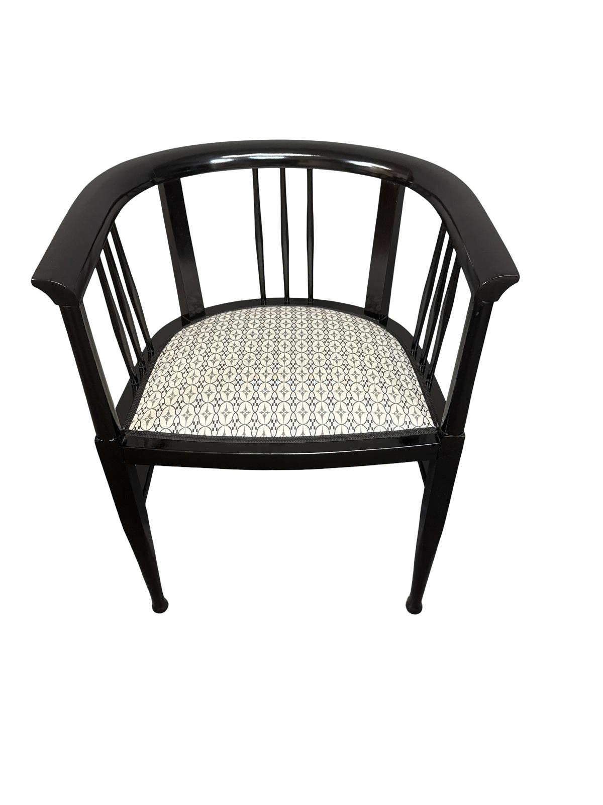 Dieser originale Jugendstil Armsessel wurde um das Jahr 1910 gefertigt und im Zuge der fachmännischen Restaurierung schwarz gebeizt und mit einem hochwertigen Jugendstil-Stoff der Firma Backhausen bezogen.
