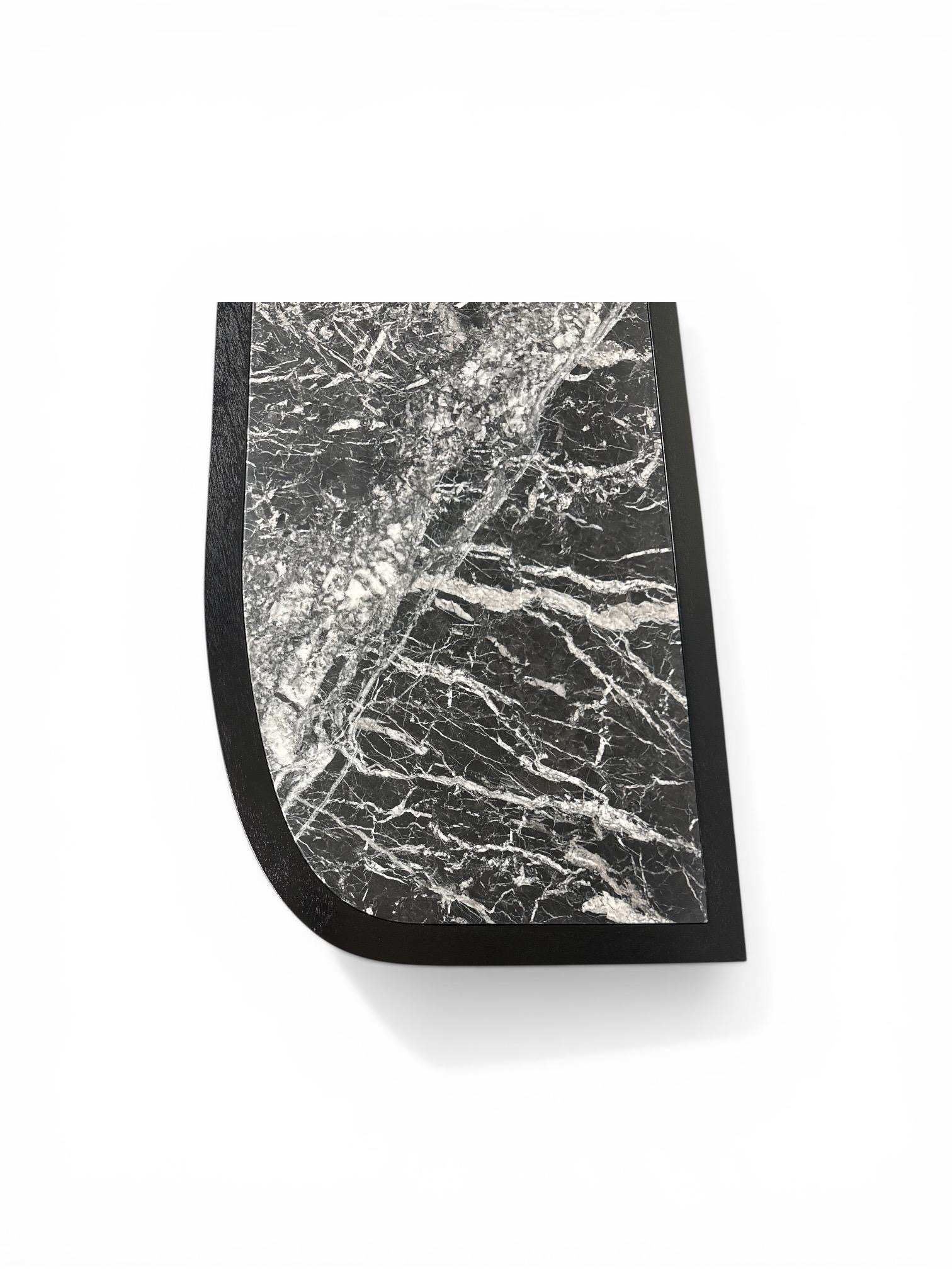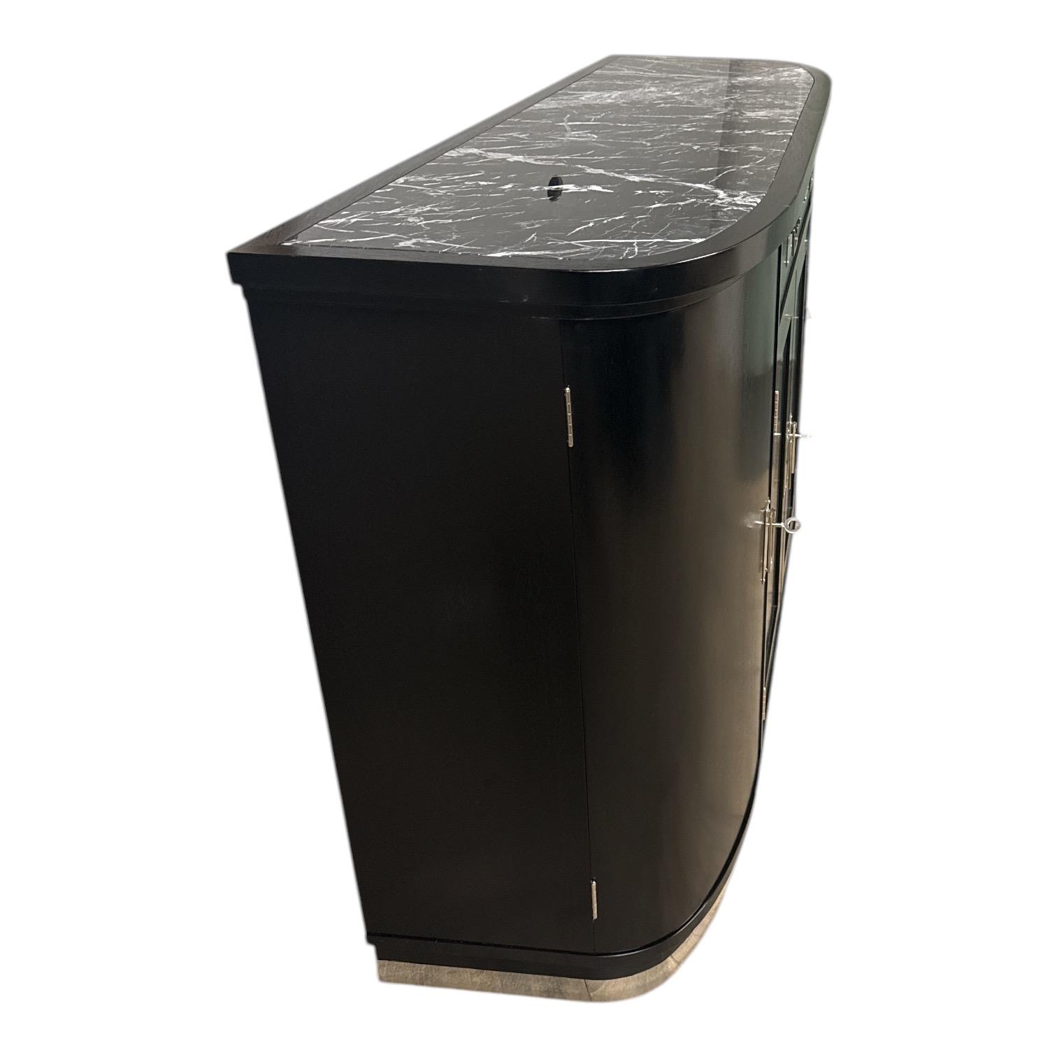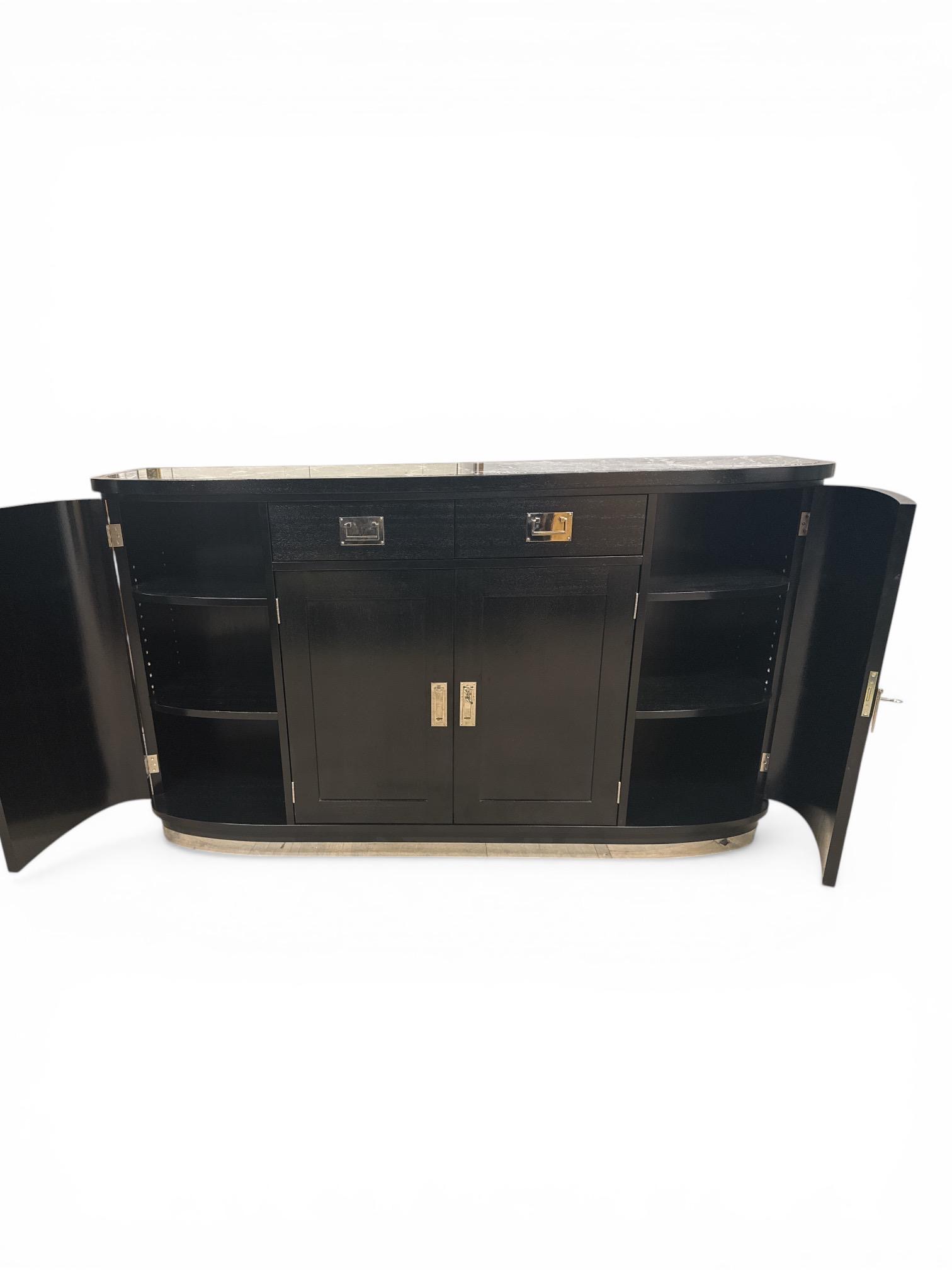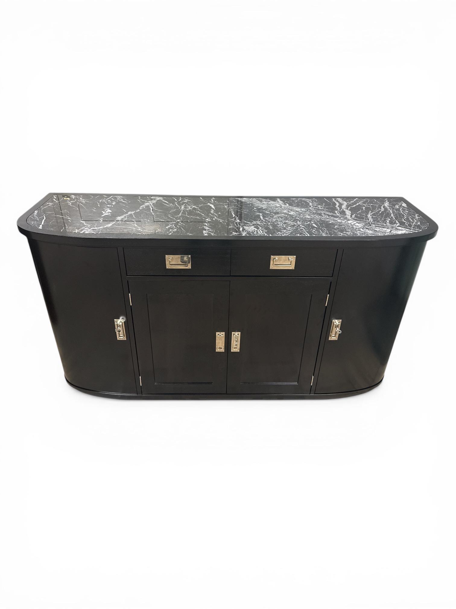 Jugendstil Anrichte, aus Mahagoniholz, schwarz lackiert mit sanft gerundeten Seiten. Ausgestattet mit einer Marmorplatte besteht aus schwarzem Marmor mit markanter, heller Maserungund originalen Messingbeschlägen. Ausgestattet mit zwei Schubladen und mehreren Türen, versehen mit schlichten Metallbeschlägen