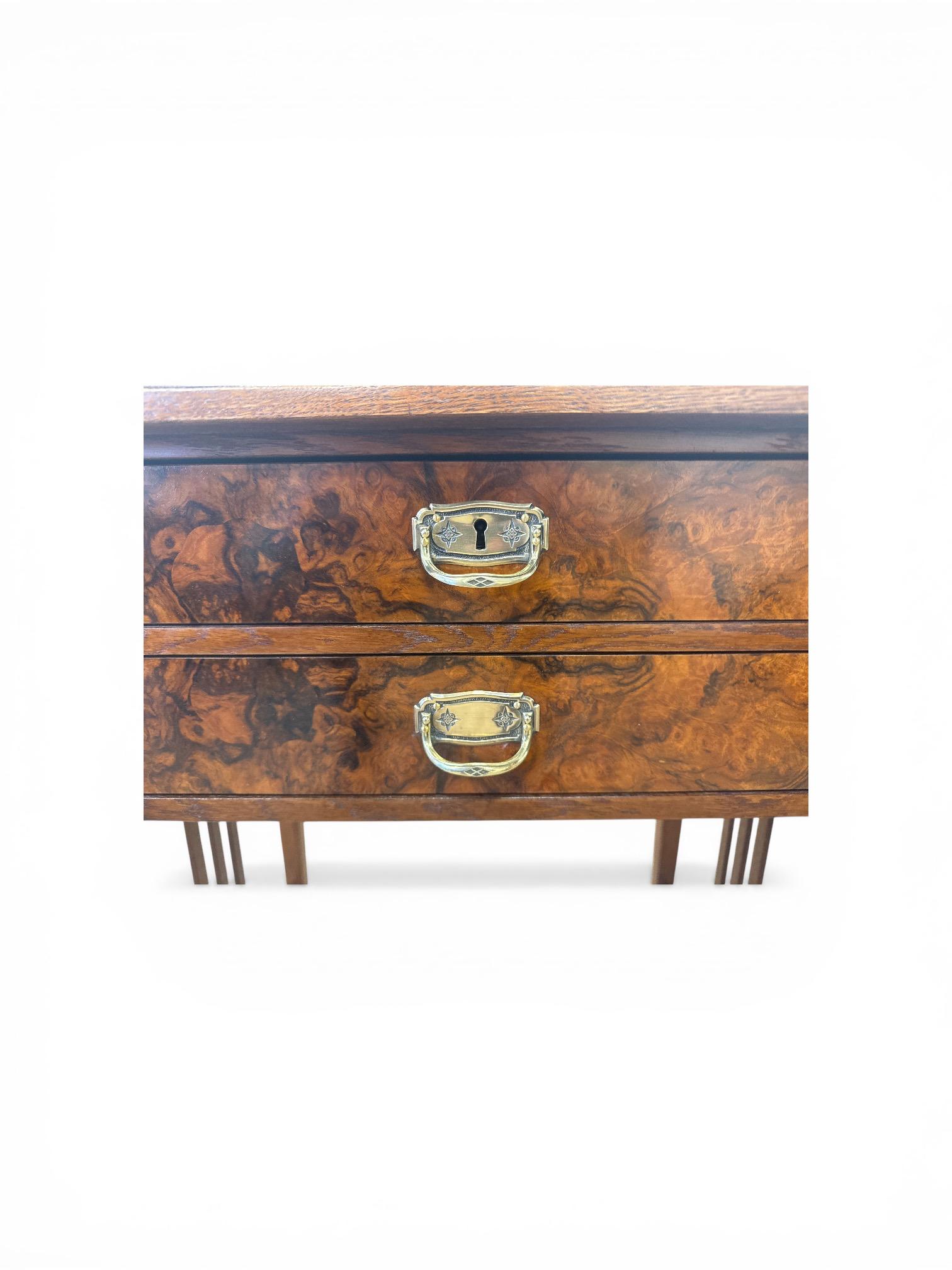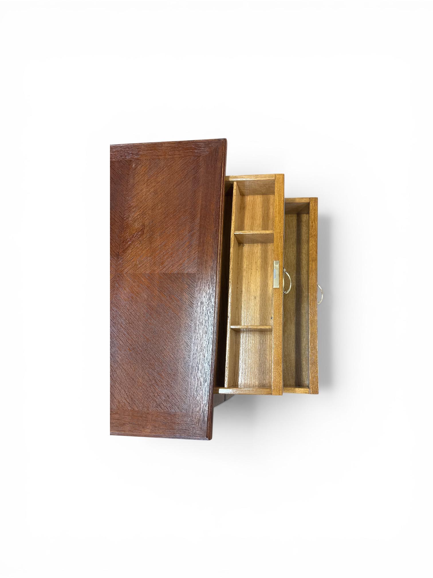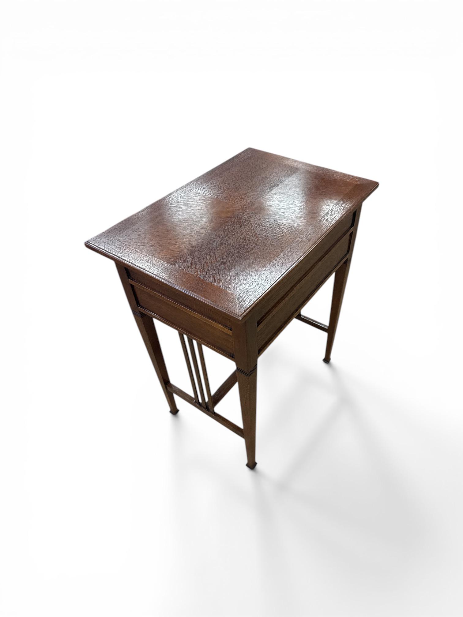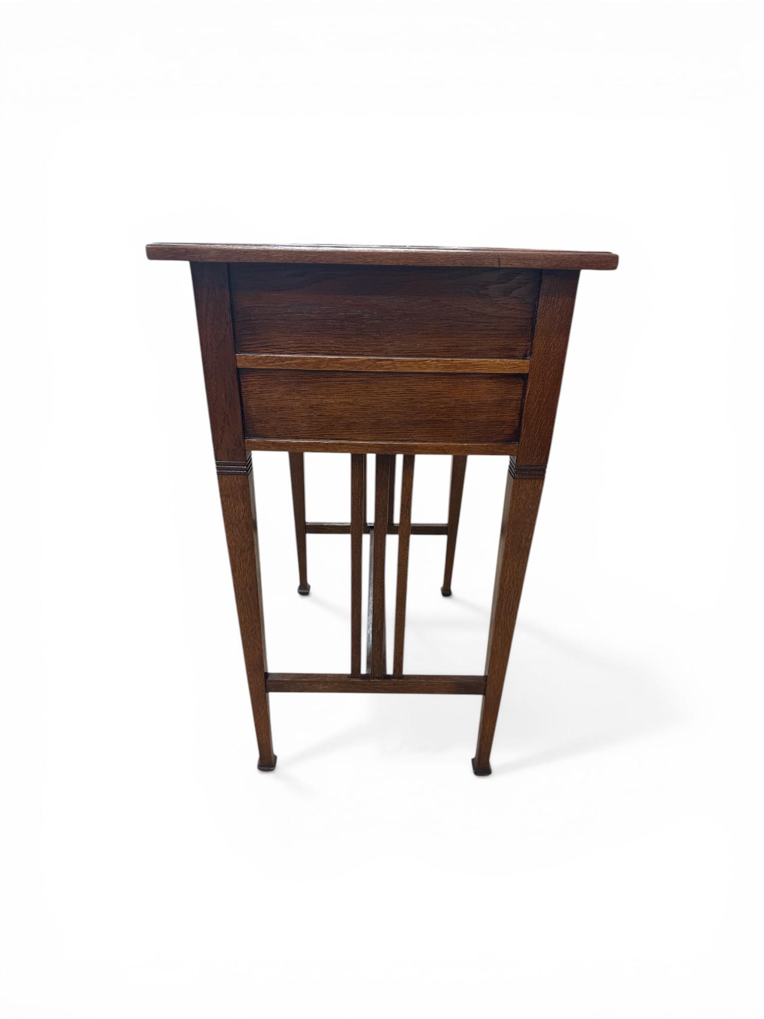 Original Jugendstil Kleintisch um 1910, gefertigt aus Eichenholz. Zwei Schubladen mit originalen Messingbeschlägen. Fachmännisch restauriert.