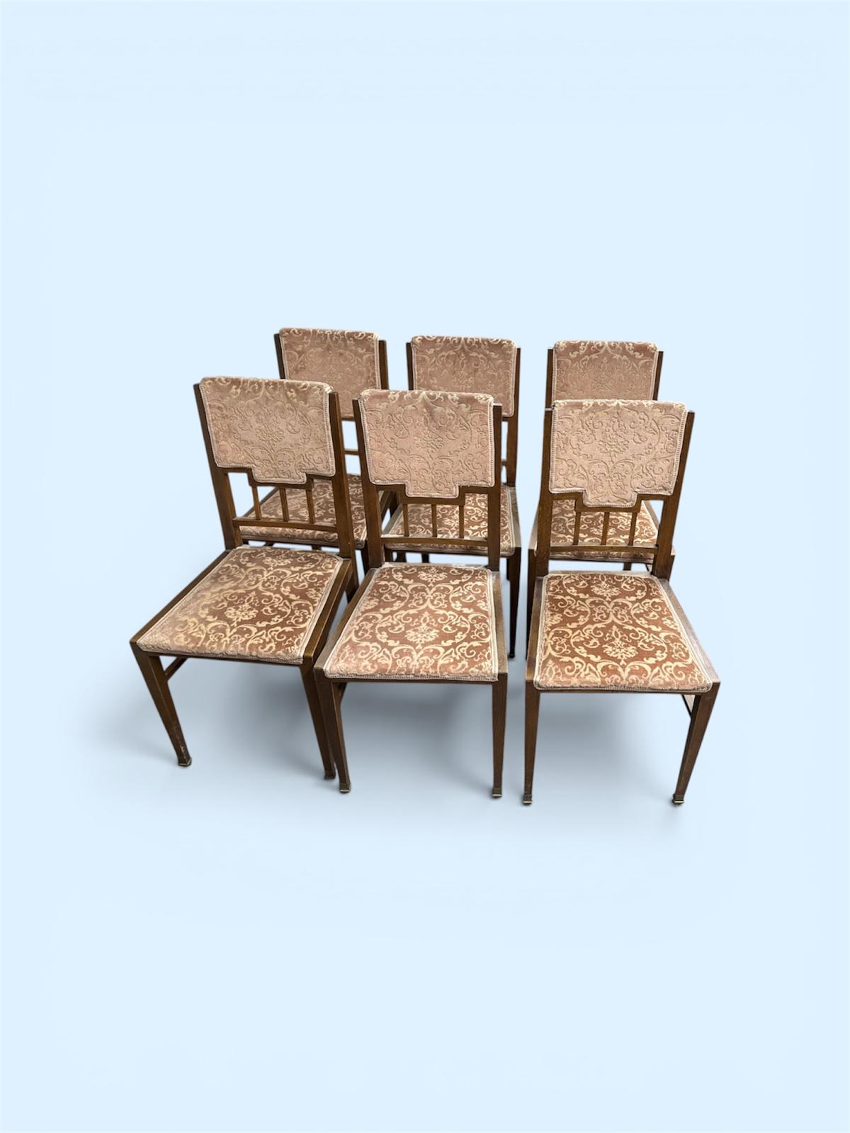 Originale Jugendstil Esszimmer-Stühle, gefertigt um das Jahr 1910 aus Nussholz. Zustand vor der Restaurierung – Farbton und Bezug nach Wunsch. Es sind sechs Stück des Modells vorhanden. Der Preis bezieht sich auf das restaurierte Stück.