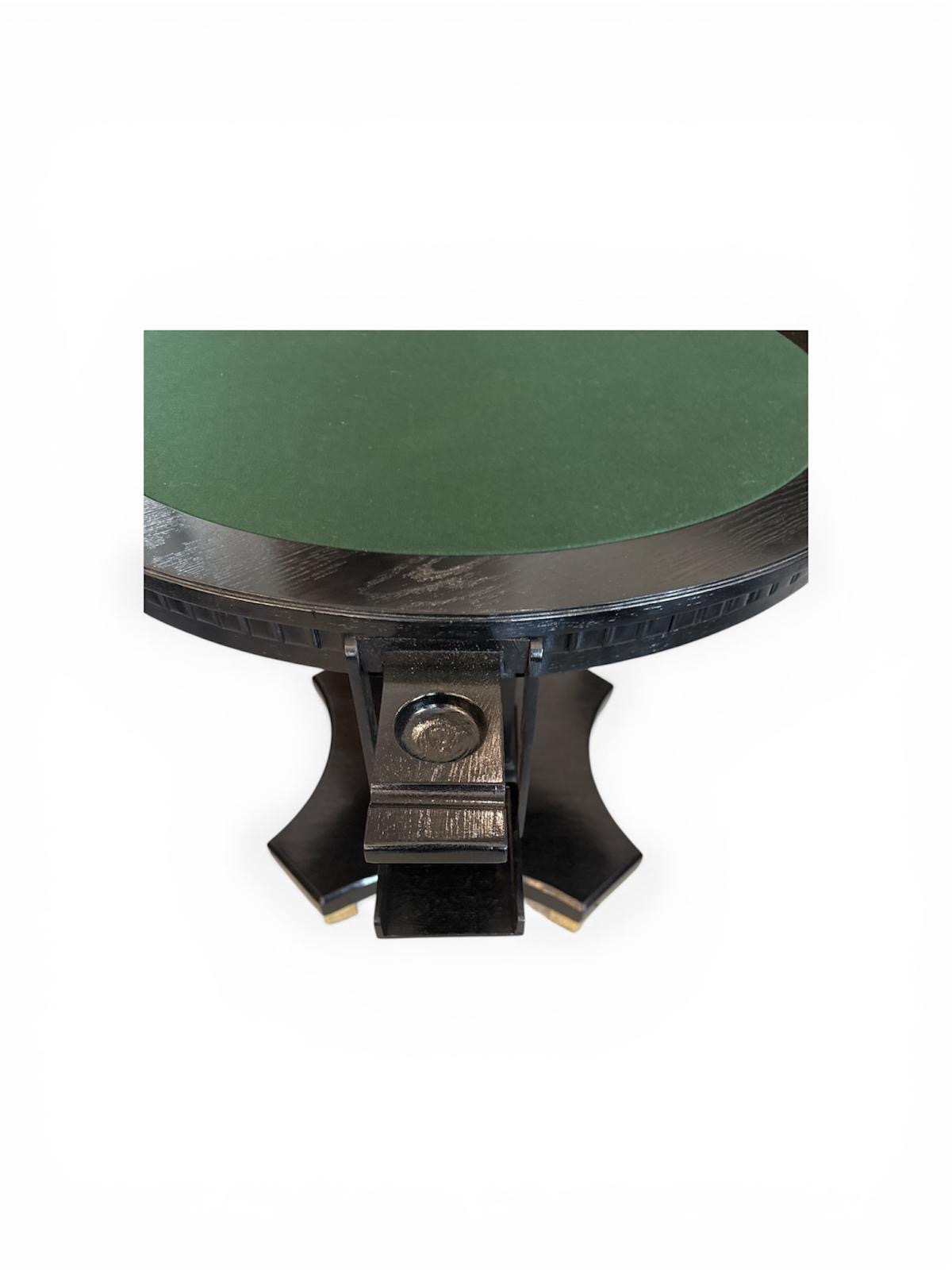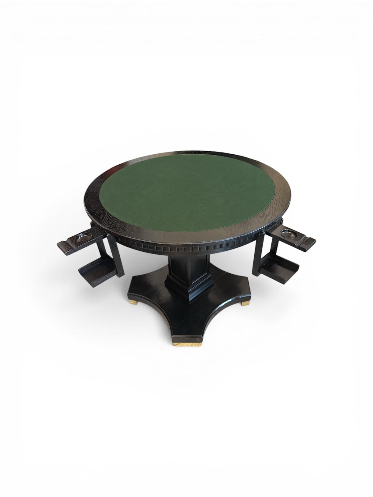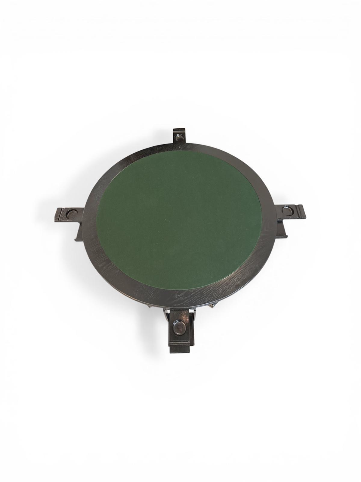 Original runder Spieltisch, gefertigt um das Jahr 1910. Vier aufklappbare Ablagemöglichkeiten für Spielsteine. Tischplatte mit grünem Filz.