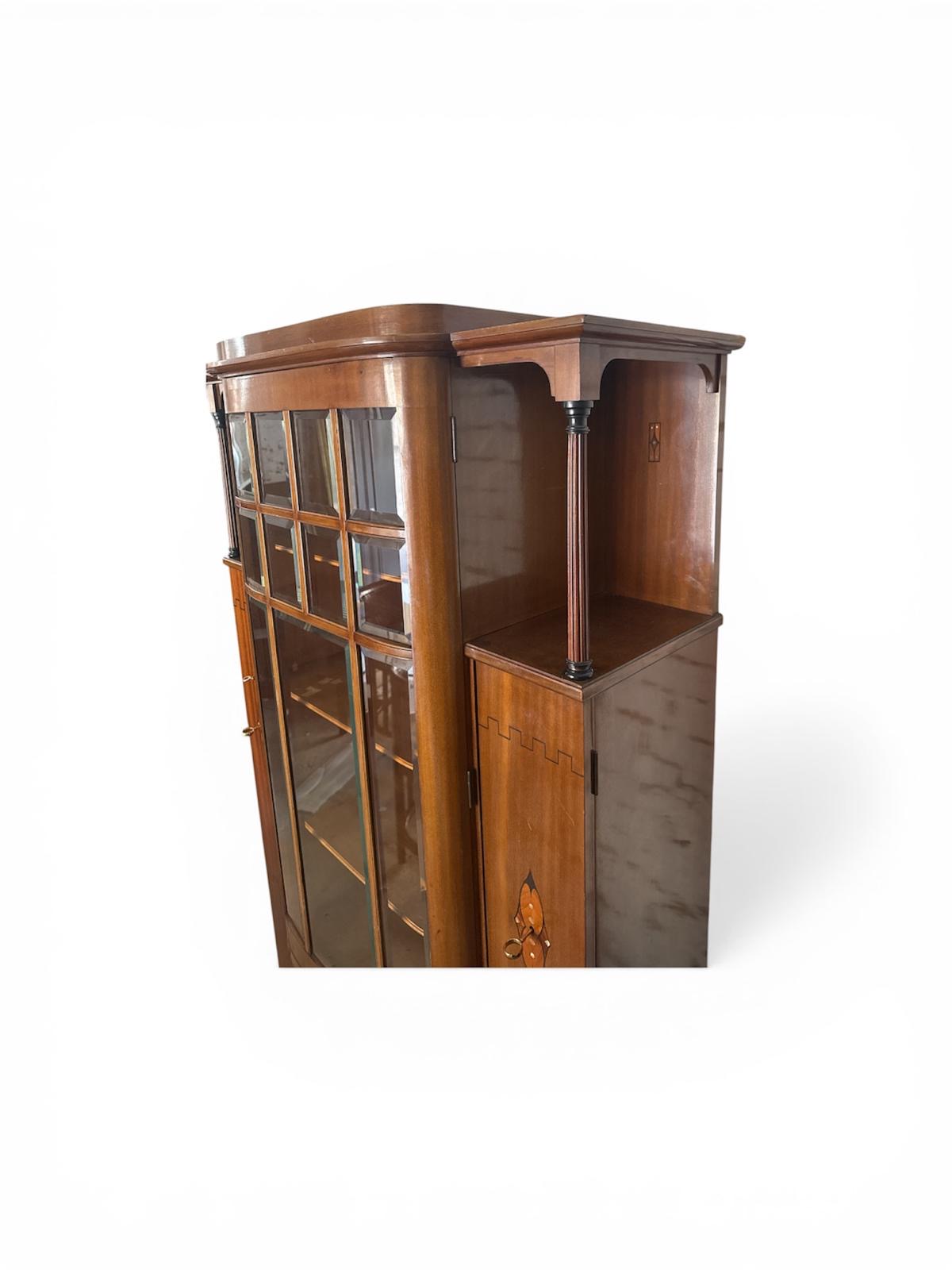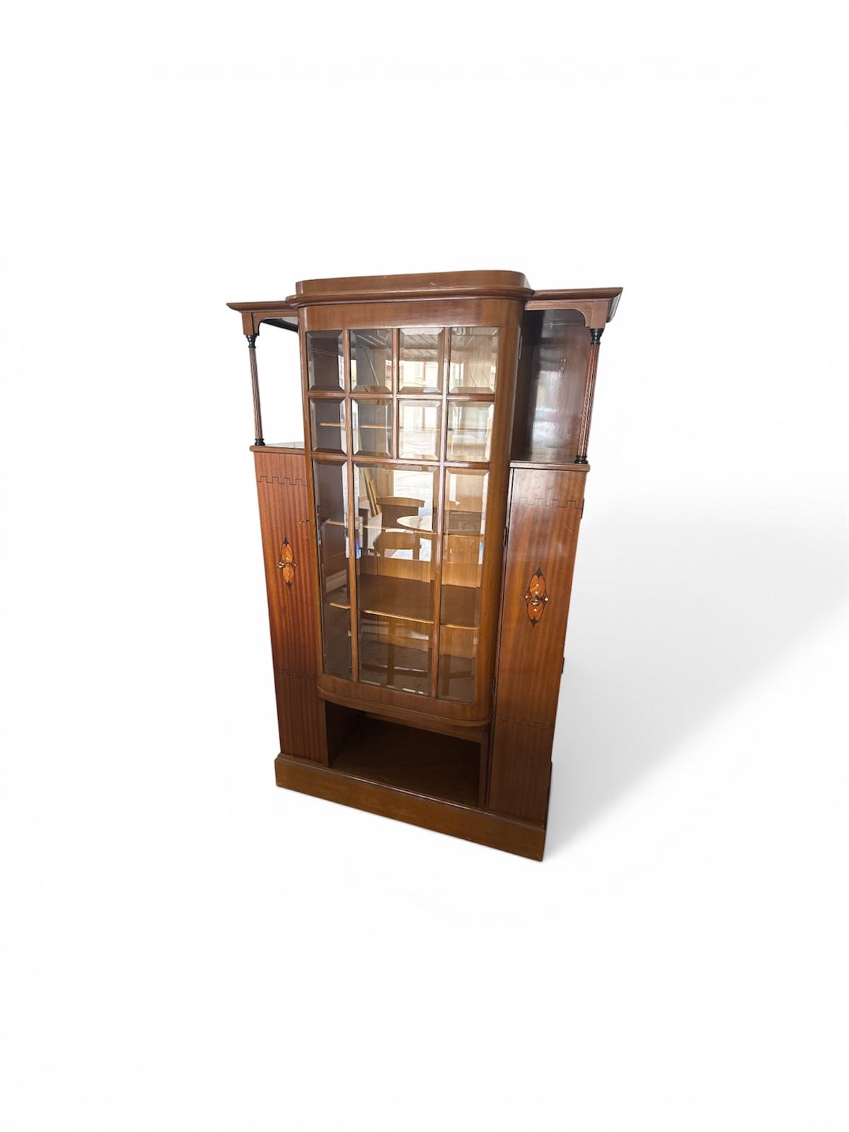 Wunderschöne originale Jugendstil Vitrine, gefertigt um das Jahr 1910 aus Mahagoni Holz. Ausgestattet mit hochwertigen Einlegearbeiten und facettiert geschliffenen Gläsern.